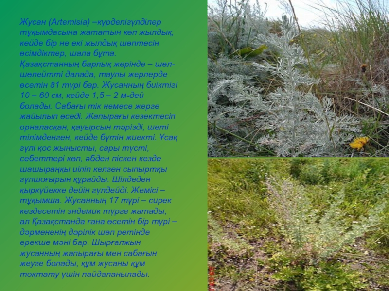 Слайд 13Жусан (Artemіsіa) –күрделігүлділер тұқымдасына жататын көп жылдық, кейде бір не екі