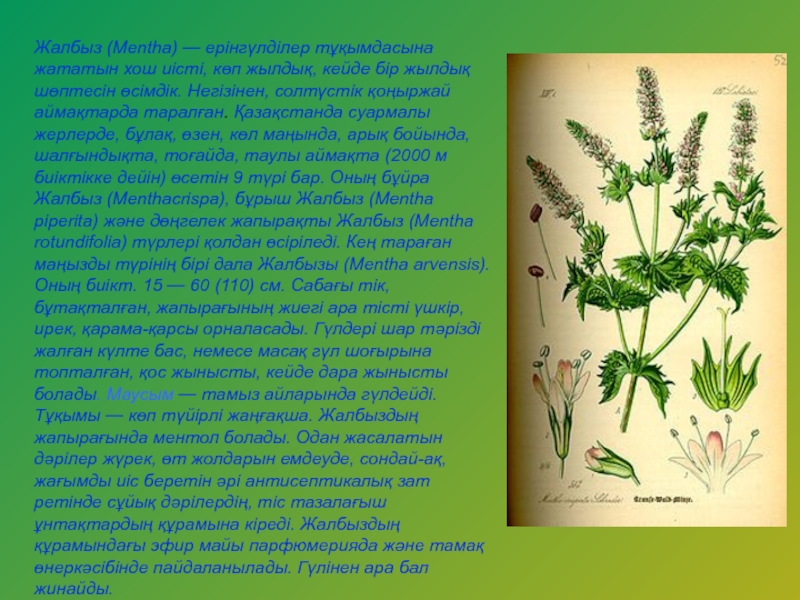 Слайд 8Жалбыз (Mentha) — ерінгүлділер тұқымдасына жататын хош иісті, көп жылдық, кейде