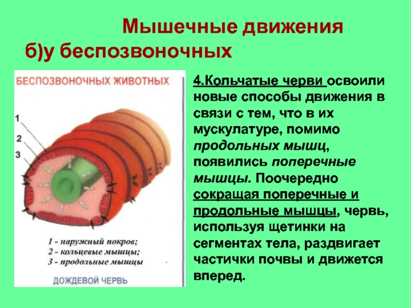 4.Кольчатые черви освоили новые способы движения в связи с тем, что в их мускулатуре, помимо продольных мышц, появились поперечные мышцы. Поочередно сокращая поперечные и продольные мышцы, червь, используя щетинки на сегментах тела, раздвигает частички почвы и движется вперед.