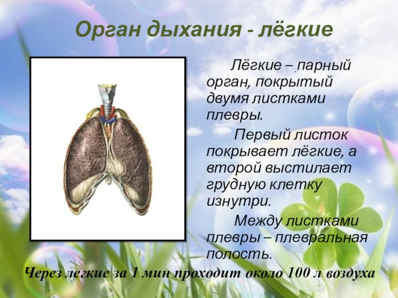 Лёгкие – парный орган, покрытый двумя листками плевры.