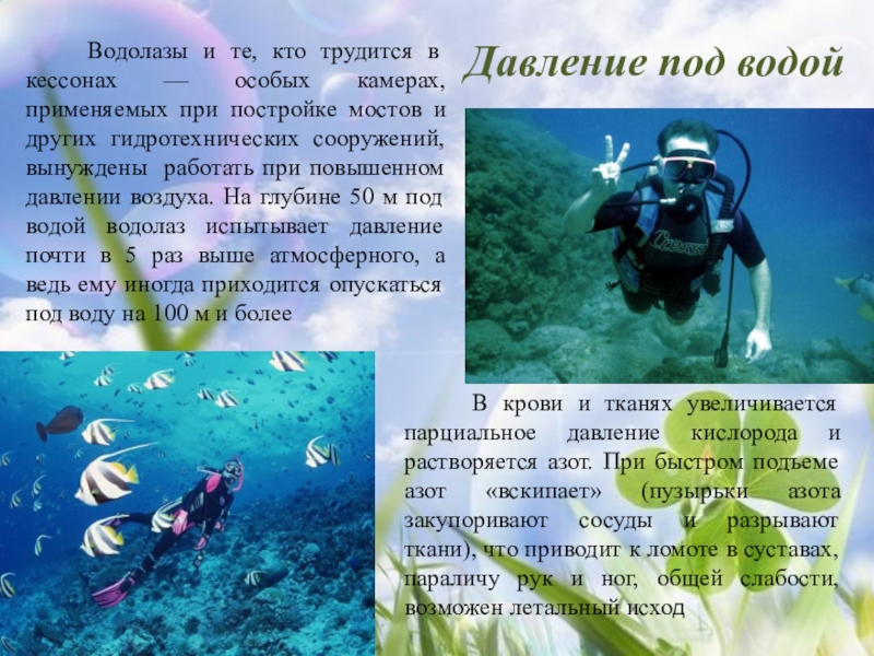 В крови и тканях увеличивается парциальное давление кислорода и растворяется азот. При быстром подъеме азот «вскипает» (пузырьки азота закупоривают сосуды и разрывают ткани), что приводит к ломоте в суставах, параличу рук и ног, общей слабости, возможен летальный исход