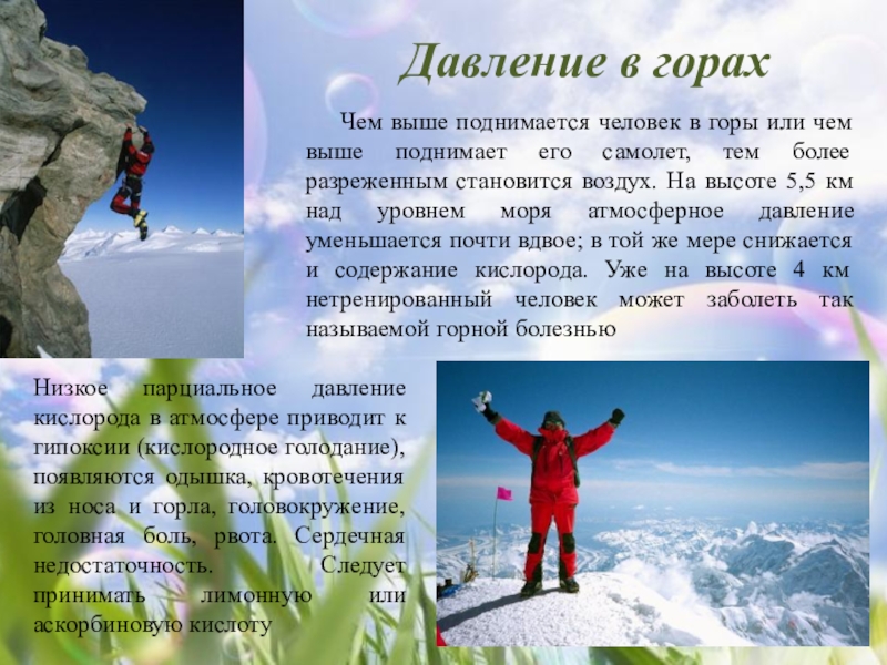 Низкое парциальное давление кислорода в атмосфере приводит к гипоксии (кислородное голодание), появляются одышка, кровотечения из носа и горла, головокружение, головная боль, рвота. Сердечная недостаточность. Следует принимать лимонную или аскорбиновую кислоту