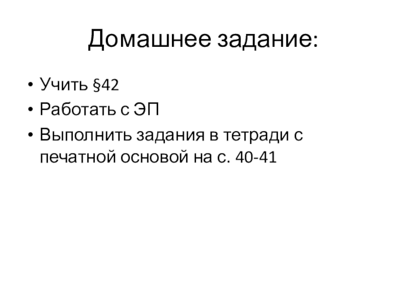 Домашнее задание:Учить §42 Работать с ЭПВыполнить задания в тетради с печатной основой на с. 40-41