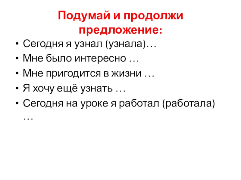 Подумай и продолжи предложение:Сегодня я узнал (узнала)…Мне было интересно …Мне пригодится в жизни …Я хочу ещё узнать