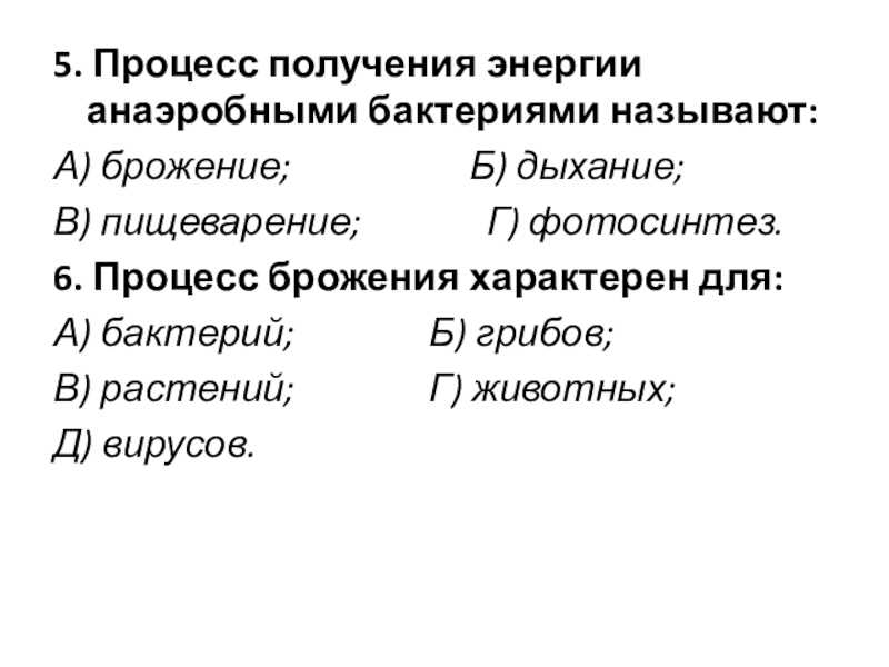 5. Процесс получения энергии анаэробными бактериями называют:А) брожение;