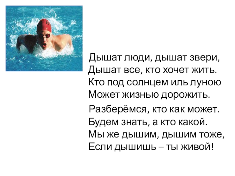 Слайд 6 Дышат люди, дышат звери, Дышат все, кто хочет жить. Кто под