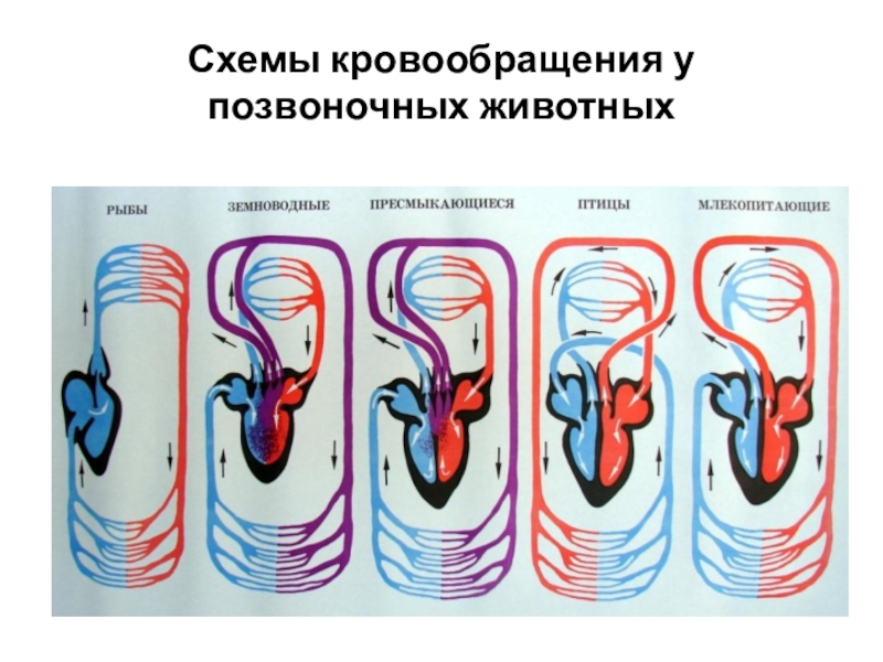 Слайд 18Схемы кровообращения у позвоночных животных