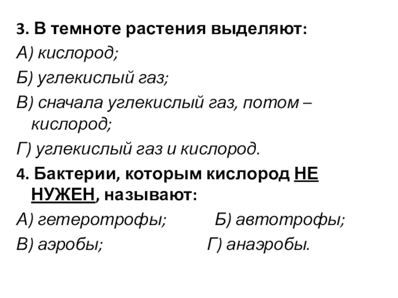 3. В темноте растения выделяют:А) кислород; Б) углекислый газ;В) сначала углекислый газ, потом – кислород;Г) углекислый газ