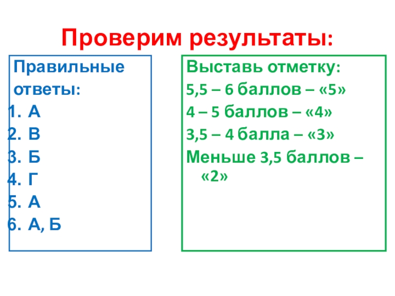 Проверим результаты:Правильныеответы:АВБГАА, БВыставь отметку:5,5 – 6 баллов – «5»4 – 5 баллов – «4»3,5 – 4 балла