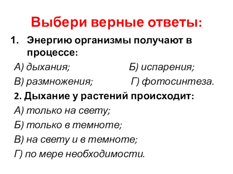 Выбери верные ответы:Энергию организмы получают в процессе:А) дыхания; Б) испарения; В) размножения; Г) фотосинтеза. 2. Дыхание у