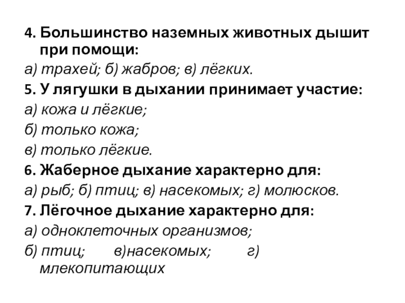 4. Большинство наземных животных дышит при помощи: а) трахей; б) жабров; в) лёгких.5. У лягушки в дыхании