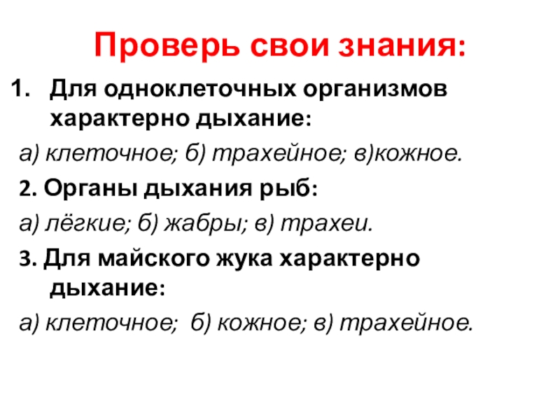 Проверь свои знания:Для одноклеточных организмов характерно дыхание: а) клеточное; б) трахейное; в)кожное.2. Органы дыхания рыб: а) лёгкие;