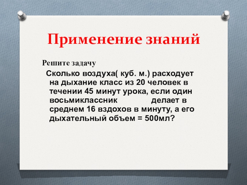 из 20 человек в течении 45 минут урока, если один восьмиклассник делает в среднем 16 вздохов в минуту, а его дыхательный объем = 500мл?