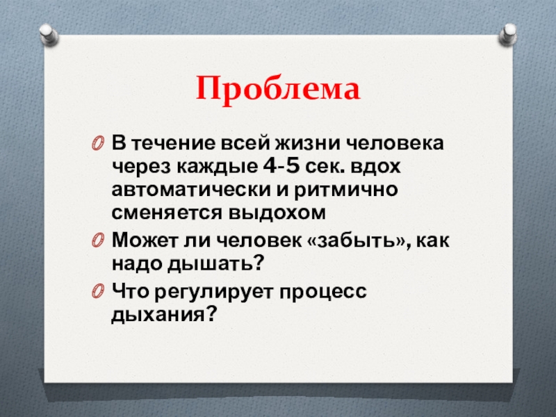 В течение всей жизни человека через каждые 4-5 сек. вдох автоматически
