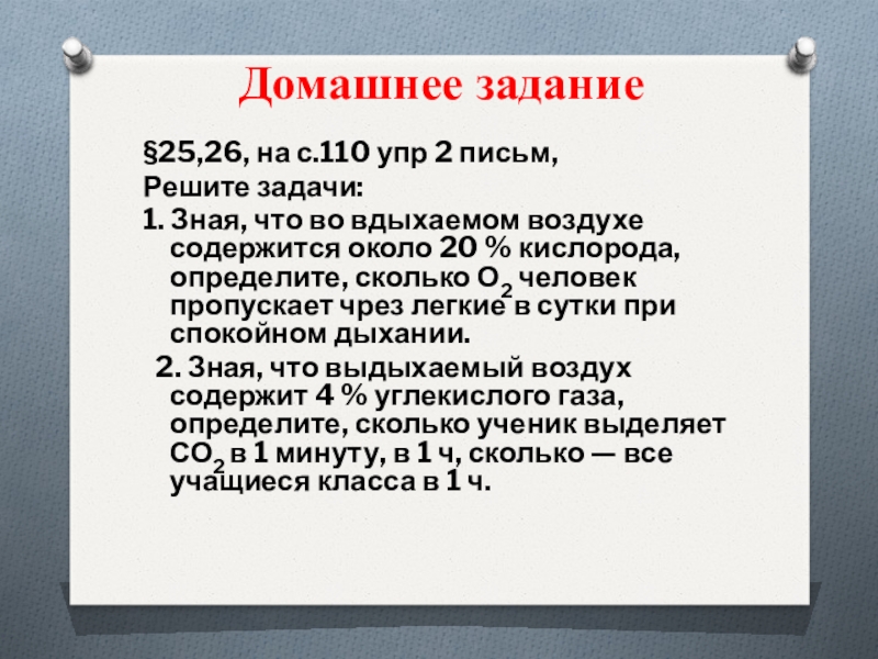 2. Зная, что выдыхаемый воздух содержит 4 % углекислого газа, определите, сколько ученик выделяет СО2 в 1 минуту, в 1 ч, сколько — все учащиеся класса в 1 ч.