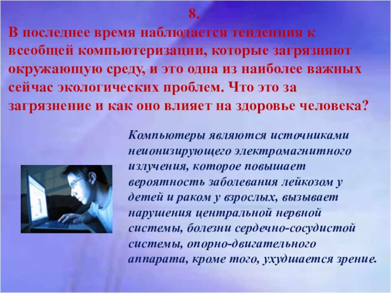Компьютеры являются источниками неионизирующего электромагнитного излучения, которое повышает вероятность заболевания лейкозом у детей и раком у взрослых, вызывает нарушения центральной нервной системы, болезни сердечно-сосудистой системы, опорно-двигательного аппарата, кроме того, ухудшается зрение.