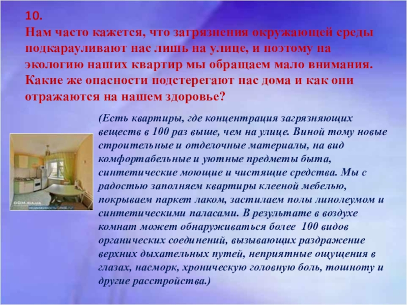 (Есть квартиры, где концентрация загрязняющих веществ в 100 раз выше, чем на улице. Виной тому новые строительные и отделочные материалы, на вид комфортабельные и уютные предметы быта, синтетические моющие и чистящие средства. Мы с радостью заполняем квартиры клееной мебелью, покрываем паркет лаком, застилаем полы линолеумом и синтетическими паласами. В результате в воздухе комнат может обнаруживаться более 100 видов органических соединений, вызывающих раздражение верхних дыхательных путей, неприятные ощущения в глазах, насморк, хроническую головную боль, тошноту и другие расстройства.)