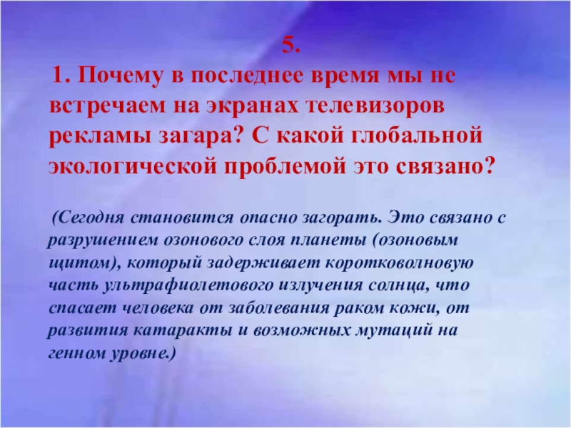 (Сегодня становится опасно загорать. Это связано с разрушением озонового слоя планеты (озоновым щитом), который задерживает коротковолновую часть ультрафиолетового излучения солнца, что спасает человека от заболевания раком кожи, от развития катаракты и возможных мутаций на генном уровне.)