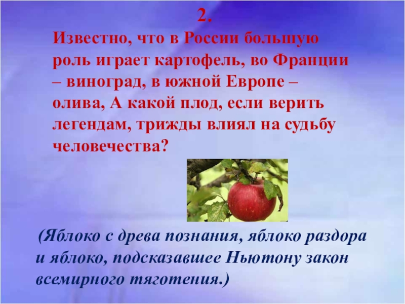 (Яблоко с древа познания, яблоко раздора и яблоко, подсказавшее Ньютону закон всемирного тяготения.)
