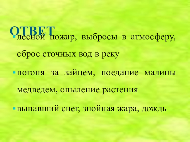 зайцем, выпавший снег, выбросы в атмосферу, поедание малины медведем, знойная жара, сброс сточных вод в реку, опыление растения, дождь