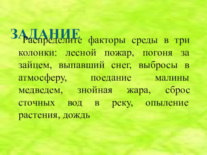 ЗАДАНИЕ Распределите факторы среды в три колонки: лесной пожар, погоня за зайцем, выпавший снег, выбросы в атмосферу,