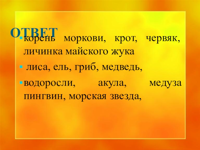 ОТВЕТкорень моркови, крот, червяк, личинка майского жука лиса, ель, гриб, медведь,водоросли, акула, медуза пингвин, морская звезда,