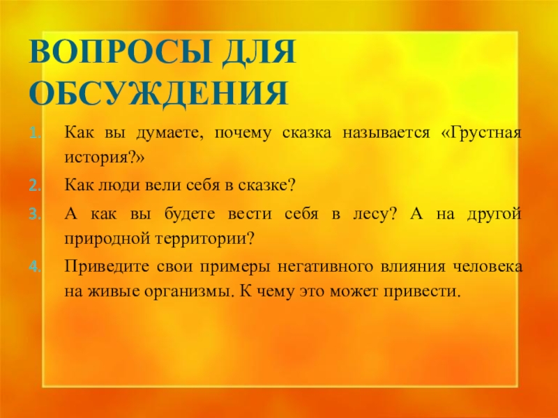 ВОПРОСЫ ДЛЯ ОБСУЖДЕНИЯКак вы думаете, почему сказка называется «Грустная история?»	Как люди вели себя в сказке?А как вы