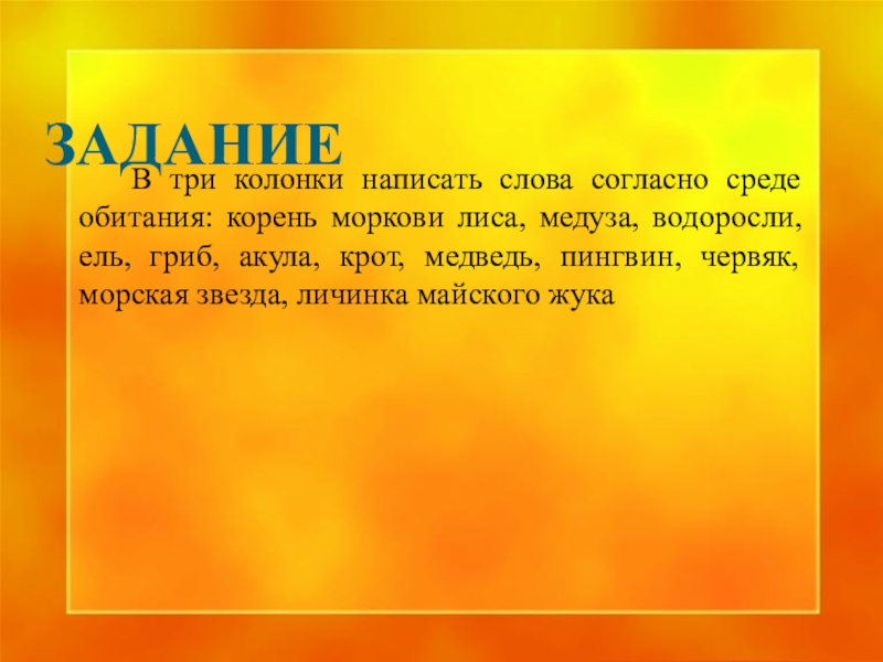 ЗАДАНИЕ   В три колонки написать слова согласно среде обитания: корень моркови лиса, медуза, водоросли, ель,