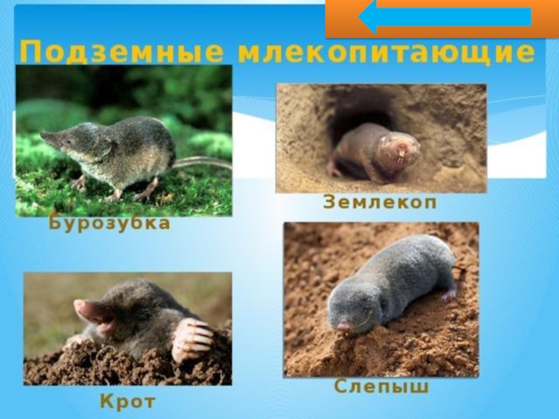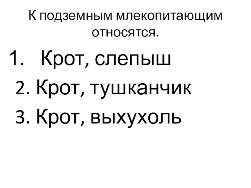 К подземным млекопитающим относятся.Крот, слепыш 2. Крот, тушканчик 3. Крот, выхухоль