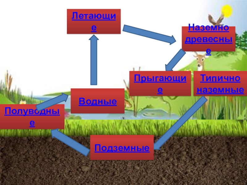 ТипичноназемныеНаземно древесныеПодземныеВодныеПолуводныеЛетающиеПрыгающие