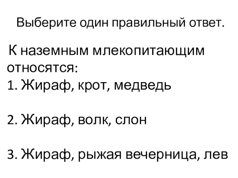 Выберите один правильный ответ.  К наземным млекопитающим относятся: 1. Жираф, крот, медведь  2. Жираф, волк, слон
