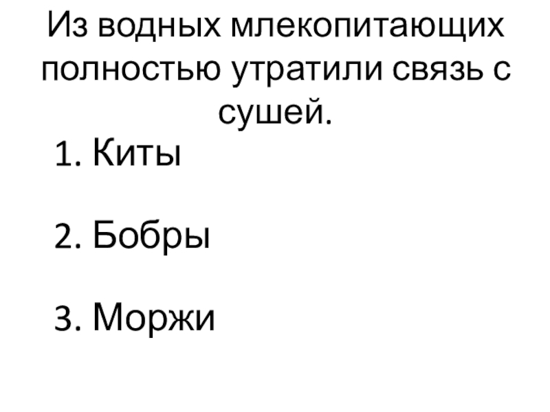 Из водных млекопитающих полностью утратили связь с сушей.  1. Киты  2. Бобры  3. Моржи