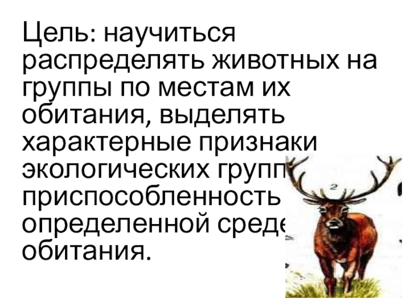 Слайд 4Цель: научиться распределять животных на группы по местам их обитания, выделять