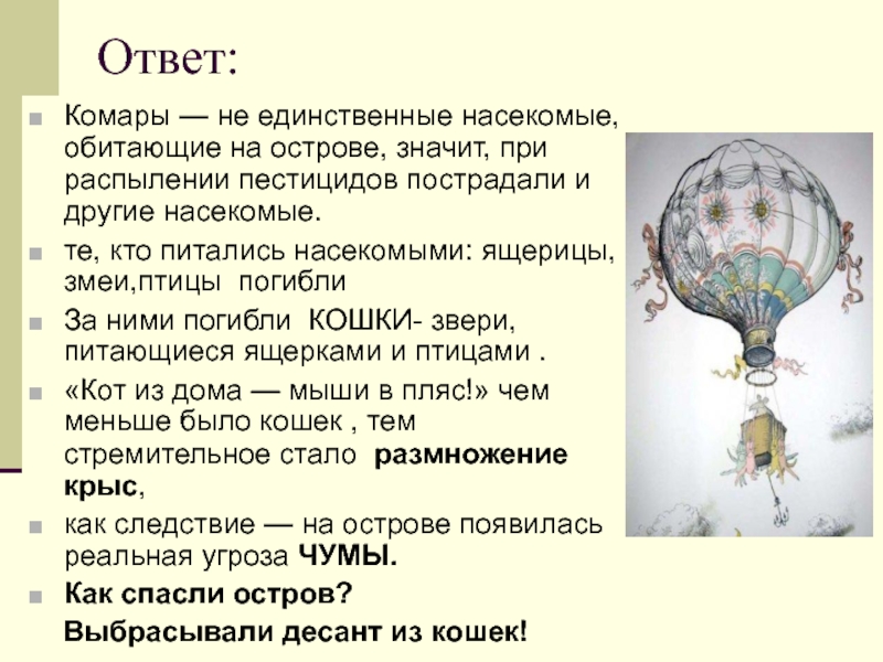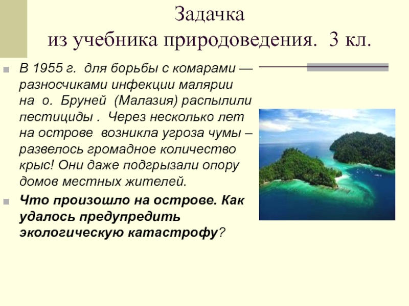 с комарами — разносчиками инфекции малярии на о. Бруней (Малазия) распылили пестициды . Через несколько лет на острове возникла угроза чумы –развелось громадное количество крыс! Они даже подгрызали опору домов местных жителей.
