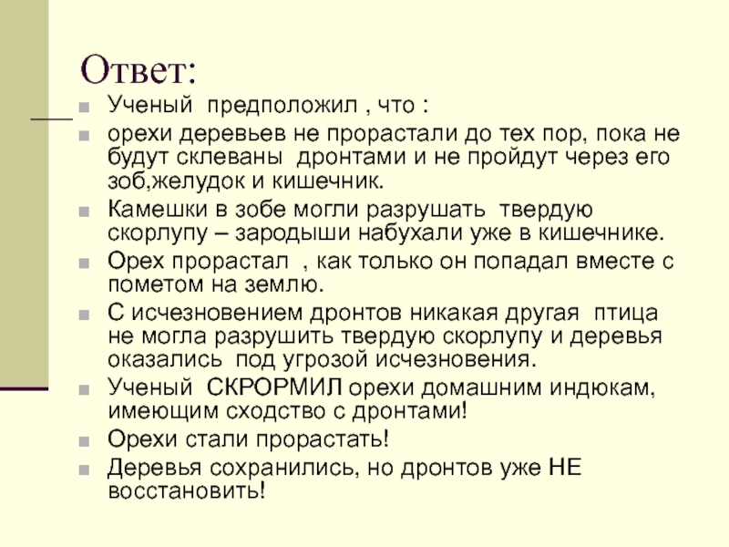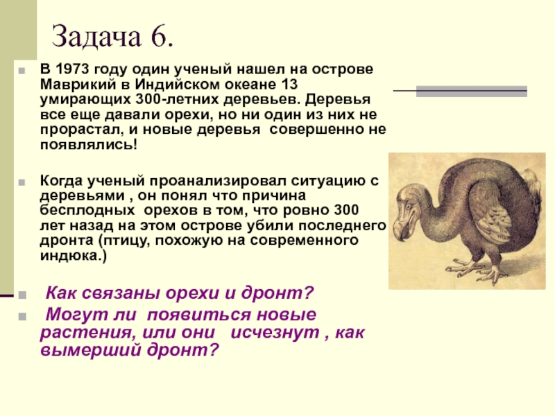 Когда ученый проанализировал ситуацию с деревьями , он понял что причина бесплодных орехов в том, что ровно 300 лет назад на этом острове убили последнего дронта (птицу, похожую на современного индюка.)