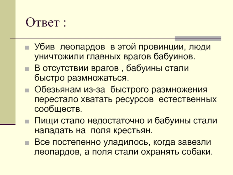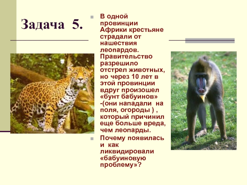 разрешило отстрел животных, но через 10 лет в этой провинции вдруг произошел «бунт бабуинов» -(они нападали на поля, огороды ) , который причинил еще больше вреда, чем леопарды.