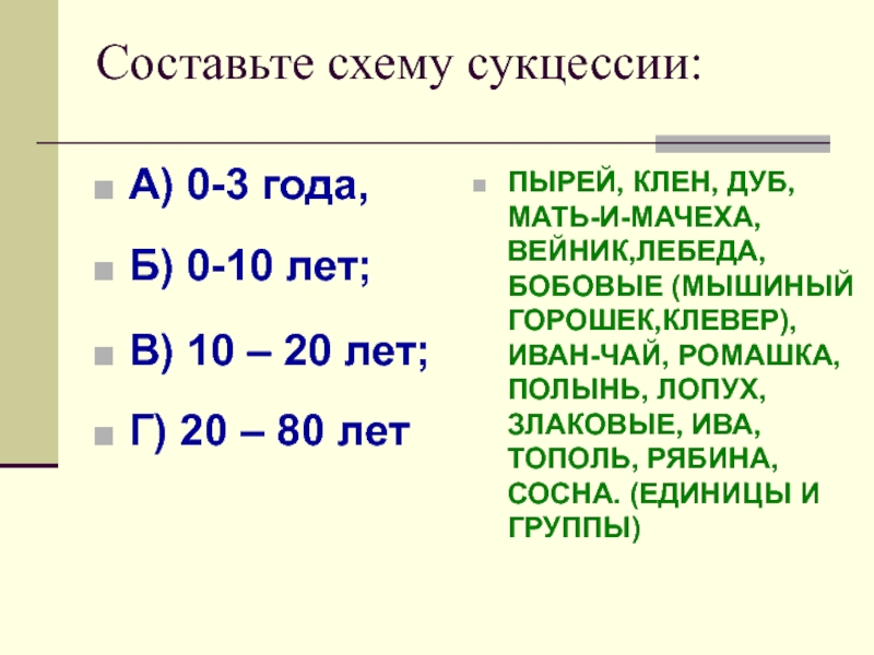 ПЫРЕЙ, КЛЕН, ДУБ, МАТЬ-И-МАЧЕХА, ВЕЙНИК,ЛЕБЕДА, БОБОВЫЕ (МЫШИНЫЙ ГОРОШЕК,КЛЕВЕР), ИВАН-ЧАЙ, РОМАШКА, ПОЛЫНЬ, ЛОПУХ, ЗЛАКОВЫЕ, ИВА, ТОПОЛЬ, РЯБИНА, СОСНА. (ЕДИНИЦЫ И ГРУППЫ)