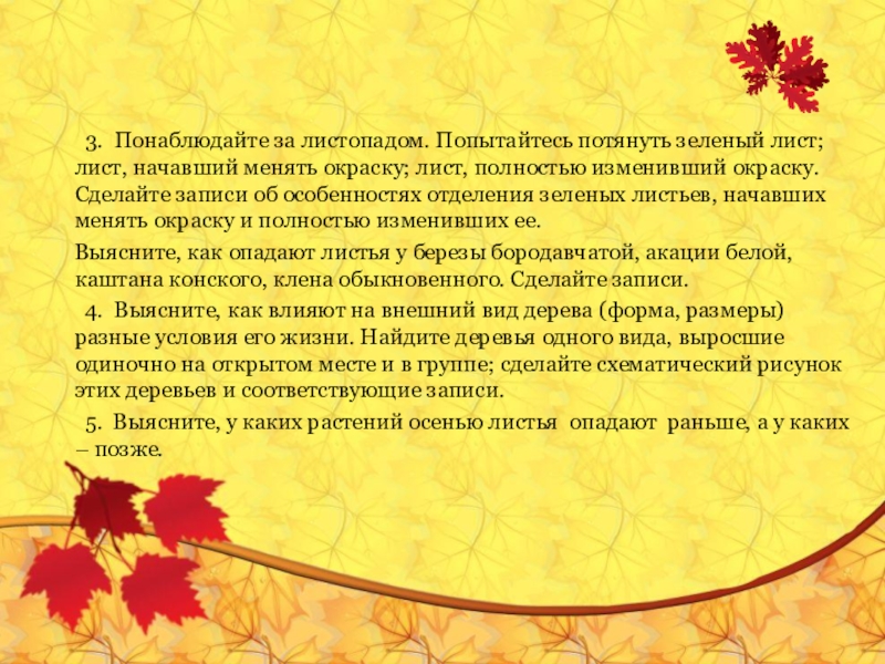Слайд 12 3. Понаблюдайте за листопадом. Попытайтесь потянуть зеленый лист; лист, начавший