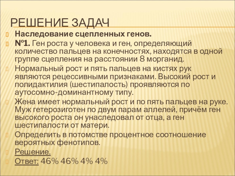 Нормальный рост и пять пальцев на кистях рук являются рецессивными признаками. Высокий рост и полидактилия (шестипалость) проявляются по аутосомно-доминантному типу.