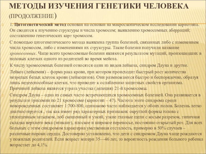 Слайд 27МЕТОДЫ ИЗУЧЕНИЯ ГЕНЕТИКИ ЧЕЛОВЕКА(ПРОДОЛЖЕНИЕ)