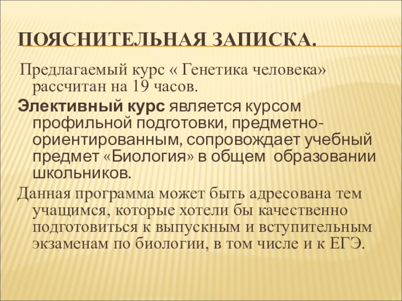 Предлагаемый курс « Генетика человека» рассчитан на 19 часов.