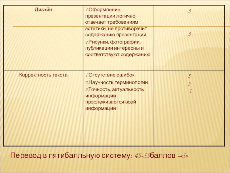 Слайд 14Перевод в пятибалльную систему: 45-55баллов -«5»