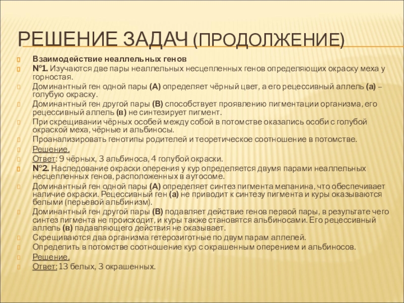 На сцепленное наследование генов и наследование сцепленное с полом. Взаимодействие неаллельных генов. Анализ родословной.