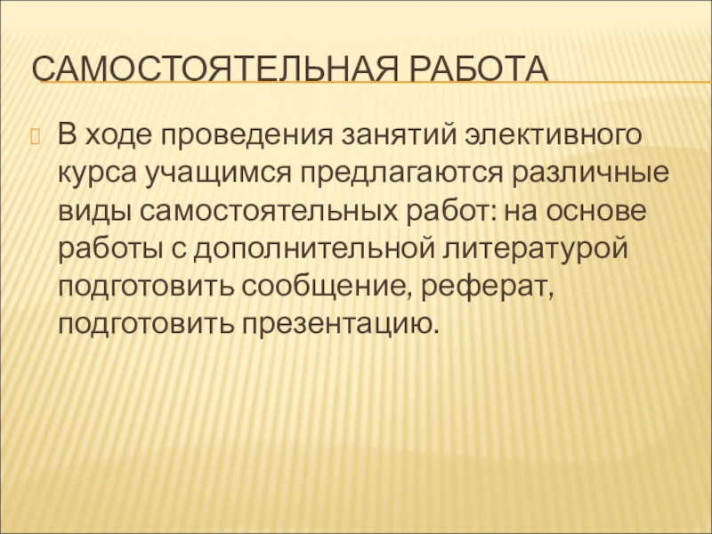 самостоятельных работ: на основе работы с дополнительной литературой подготовить сообщение, реферат, подготовить презентацию.