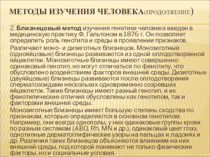 Слайд 25МЕТОДЫ ИЗУЧЕНИЯ ГЕНЕТИКИ ЧЕЛОВЕКА(ПРОДОЛЖЕНИЕ)