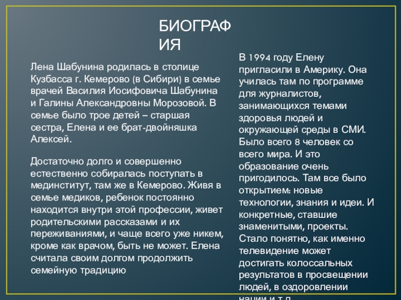 В 1994 году Елену пригласили в Америку. Она училась там по программе для журналистов, занимающихся темами здоровья людей и окружающей среды в СМИ. Было всего 8 человек со всего мира. И это образование очень пригодилось. Там все было открытием: новые технологии, знания и идеи. И конкретные, ставшие знаменитыми, проекты. Стало понятно, как именно телевидение может достигать колоссальных результатов в просвещении людей, в оздоровлении нации и т.д.