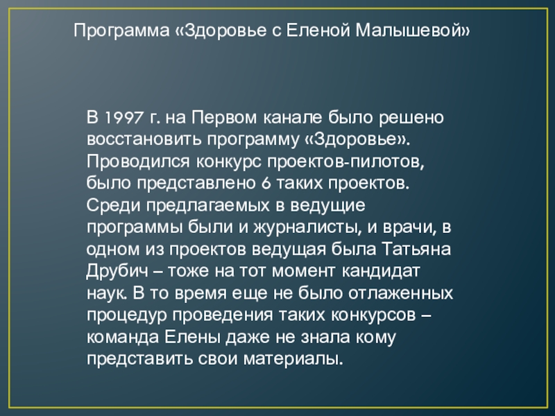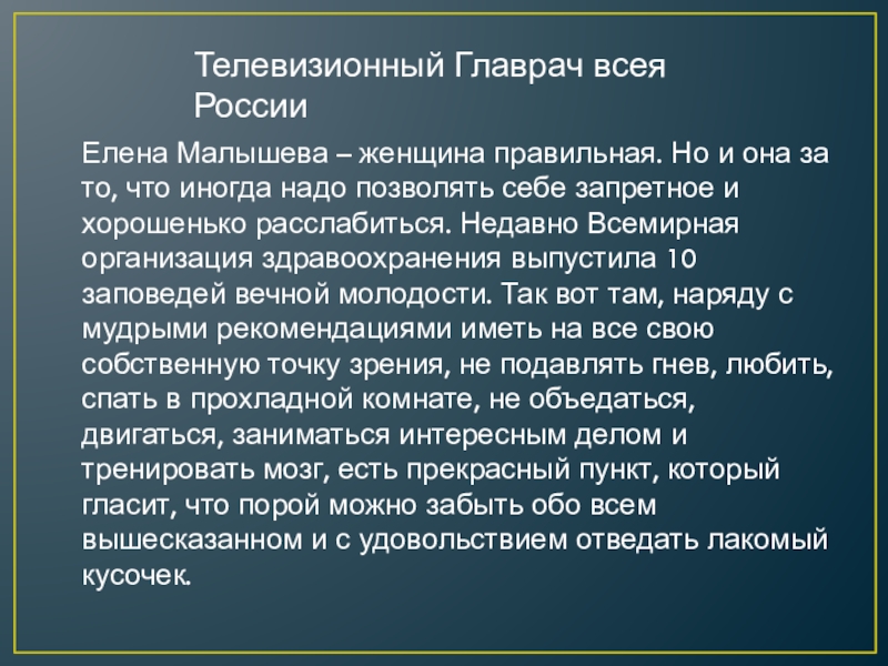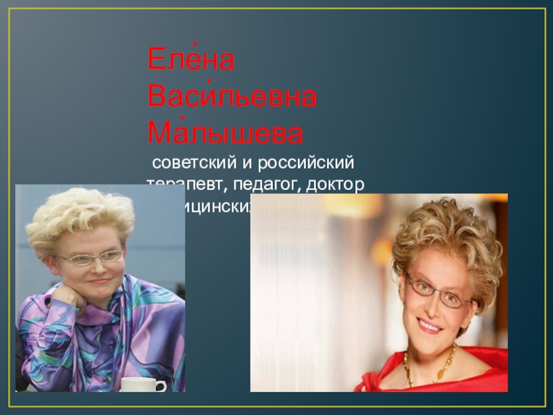 Внутреннее ощущение себя врачом-специалистом, глубокое понимание того, что она рассказывает людям и передаваемое через экран ее чувство ответственности сделали Елену Малышеву обладателем самого высокого рейтинга доверия среди всех женщин-телеведущих России.