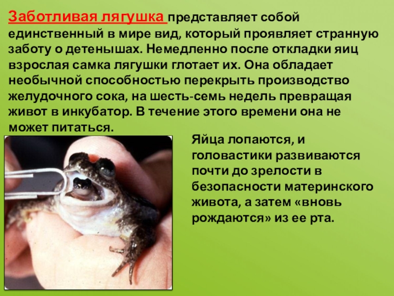Яйца лопаются, и головастики развиваются почти до зрелости в безопасности материнского живота, а затем «вновь рождаются» из ее рта.