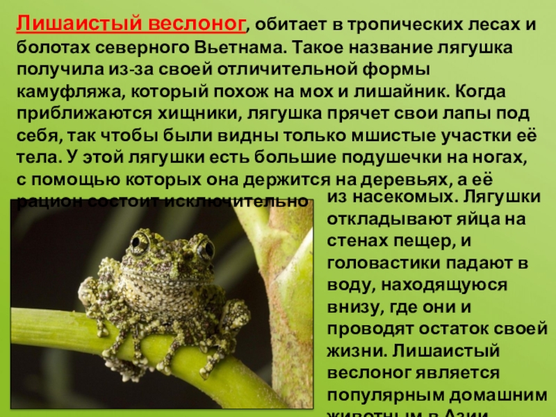 из насекомых. Лягушки откладывают яйца на стенах пещер, и головастики падают в воду, находящуюся внизу, где они и проводят остаток своей жизни. Лишаистый веслоног является популярным домашним животным в Азии.