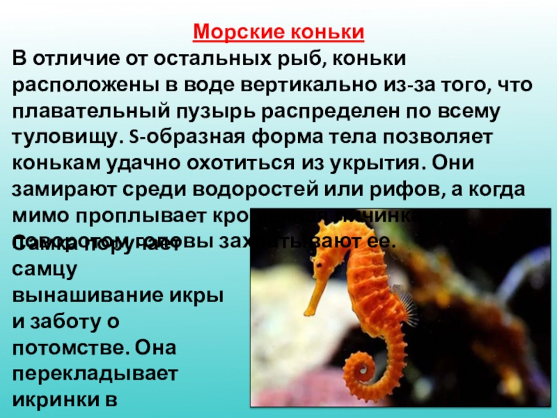 Самка поручает самцу вынашивание икры и заботу о потомстве. Она перекладывает икринки в специальную сумку на теле самца.